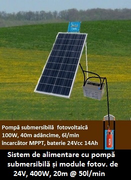 ![]() | Sistemul propus este destinat, cu precădere, zonelor izolate de rețeaua publică de electricitate pentru: - alimentării de cisterne sau piscine, - alimentare cu apă de la o familie sau câteva familii până la un cătun, - alimentare cu apă instituții publice cum ar fi școli (350 elevi), grădinițe, policlinici, - alimentare cu apă pentru ferme de animale, - irigare grădini sau culturi până la nivel de 1-3 ha, funcție cultură și sol, etc. Sursa energetică poate fi fie solară, fie eoliană, fie hibridă, de 400W. Tensiunea de alimentare standard e de 24Vcc, dar poate varia într-o plajă largă (18-45Vcc), ceea ce este un avantaj important. Pompa e submersibilă și ridică apa la 20m la un debit de 3mc/h. Considerând 4h insolație, în medie pe zi, ajungem 12mc/zi sau 360mc/lună apă pompată. În sezonul cald se poate atinge ușor 500mc/lună, iar în sezonul rece datorită radiație scăzute (decembrie cea mai rea) volumul de apă ridicat din puț scăde la jumătate. Din ORDINUL Nr. 29/N din 23.12.1993 pentru aprobarea Normativului-cadru privind contorizarea apei si a energiei termice la populatie, institutii publice si agenti economici avem între altele și consumul normat pentru rezidențial de 6mc/pers/lună, pentru o Policlinică 10mc/robinet/lună, respectiv pentru școli de 1mc/elev/lună. Atunci dacă o persoană consumă în medie 6mc/lună prin urmare sistemul ar susține consumul a 60 de persoane lunar, ceea ce poate acoperi un cătun de 10-15 case locuite, la standard de oraș. În cazul școlilor sistemul propus ar acoperi unități școlare cu până la 360 de elevi și profesori. În cazul unei Policlinici medii, cu 14 cabinete individuale ce lucrează simultan, plus 4 robinete pentru întreținere și susținători, deci cu 18 robinete și un consum de 180mc/lună, sistemul propus acoperă consumul normat tot anul, inclusiv în luna decembrie. În domeniul culturilor vegetale luăm ca exemplu o cultură porumb, care pe un hectar poate cere 900mc pe toată perioada de vegetație de 5 luni, adică avem nevoie în medie de 180mc apă pe lună. L-a un asemenea consum în cazul unei secete pe toată perioada de vegetație sistemul poate iriga 2ha de cultură de porumb. Un astfel de sistem de alimentare cu apă energizată solar prin panouri fotovoltaice, presupunând că beneficiarul are instalația de apă/canal (puțul, rezervorul, canalizarea sau fosa septică, canale de irigații, etc), după caz, costul oscilează între 5000lei și 10.000lei, funcție de condițiile locale concrete. |